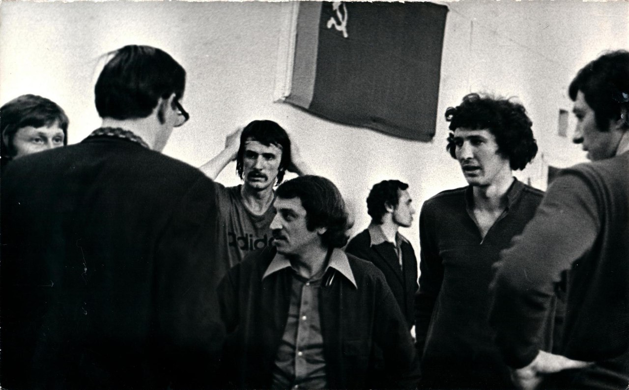 Владимир Иванович Чумаков (в центре) проводит установку на игру во время чемпионата РСФСР в Челябинске. Слева направо: Г. Романенко, М. Филимонов (тренер), А. Исаченко-ст., В. Чумаков, А. Дёмин, А. Ковалёв, А. Сологуб.